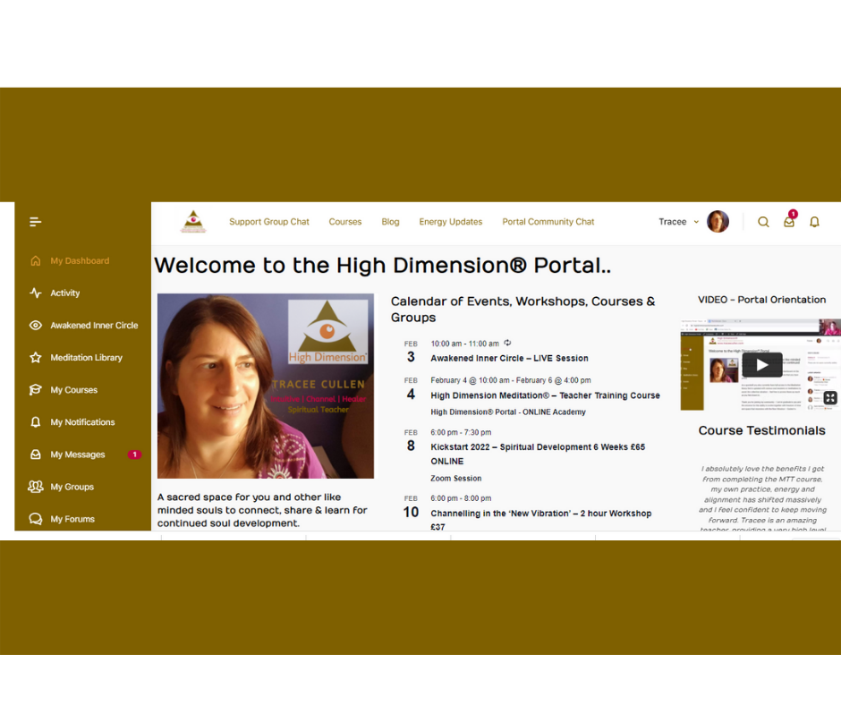 Once you join the group you will be emailed a user name and password to access the High Dimension® Portal which is simply, an ONLINE sacred space created as a standalone, private & secure website.